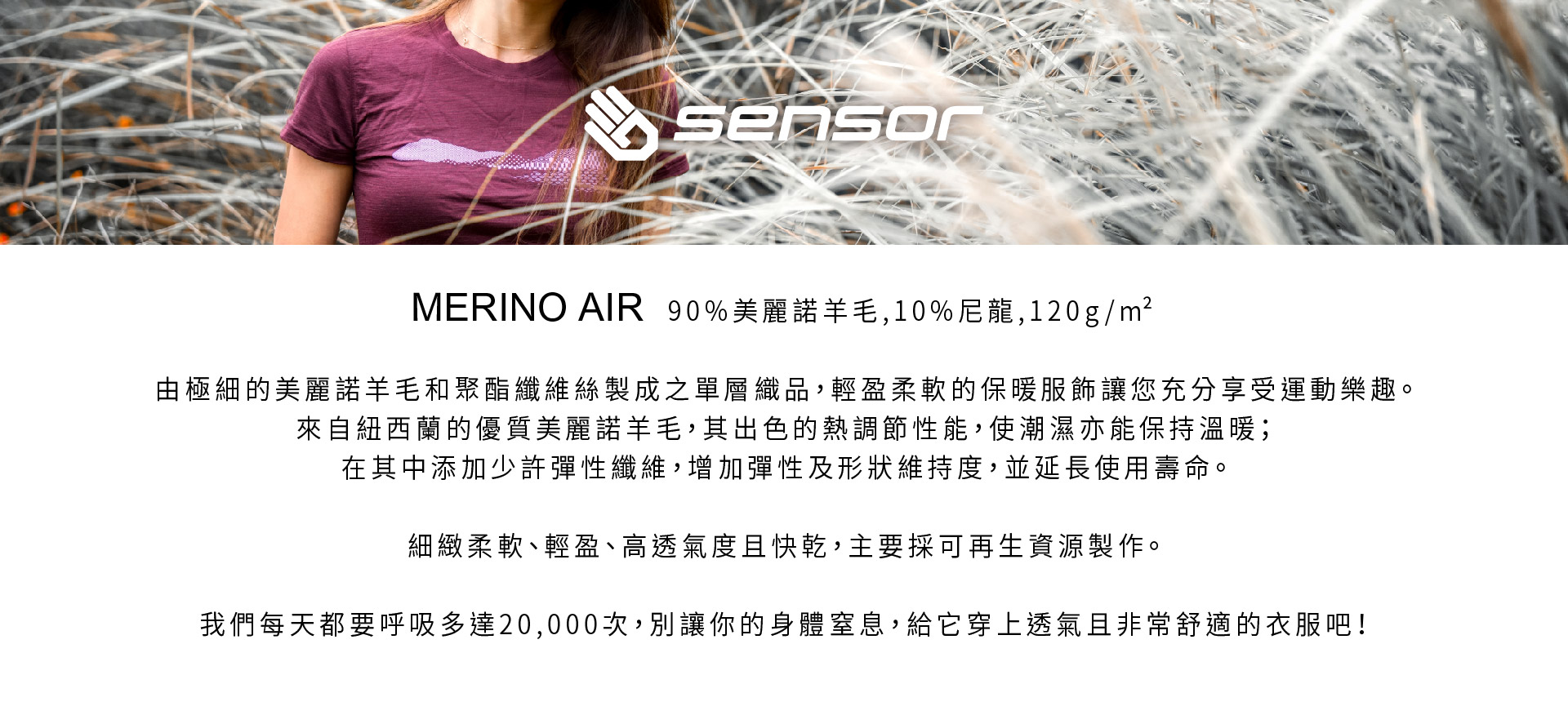 輕量快乾/高透氣/天然調溫/抗菌防臭/彈性耐用