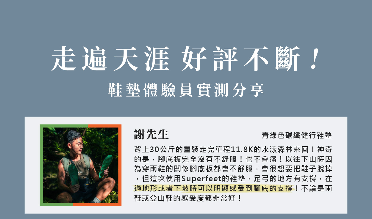 自 1977 年以來,Superfeet 藉由改變人們穿鞋的方式,完成了許多驚人的成就與目標。由於有著百年足部研究室的深厚基礎,Superfeet 以足部醫學的原理設計了優異而實惠的鞋墊,一雙輕薄多功能的鞋墊,改變的不僅是足部的不適,更能藉此調整身體的習慣與姿勢,讓雙足發揮最原始而自然的力量。
