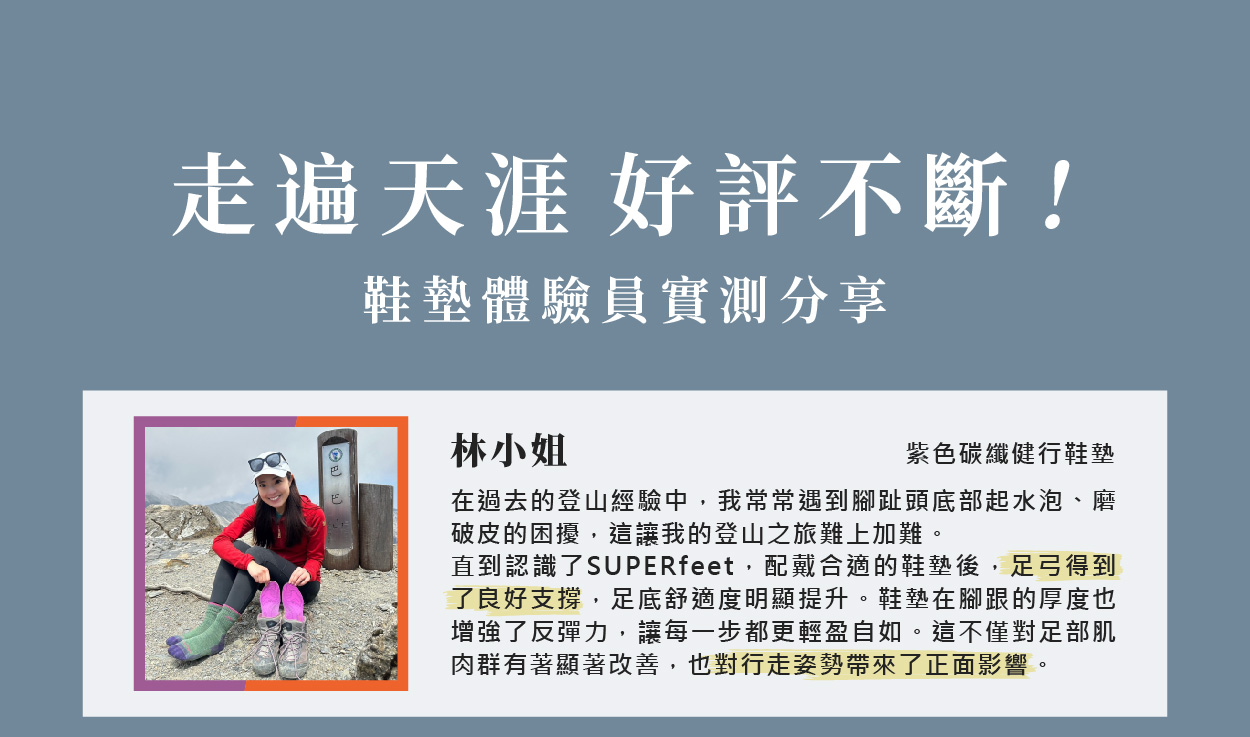 自 1977 年以來,Superfeet 藉由改變人們穿鞋的方式,完成了許多驚人的成就與目標。由於有著百年足部研究室的深厚基礎,Superfeet 以足部醫學的原理設計了優異而實惠的鞋墊,一雙輕薄多功能的鞋墊,改變的不僅是足部的不適,更能藉此調整身體的習慣與姿勢,讓雙足發揮最原始而自然的力量。