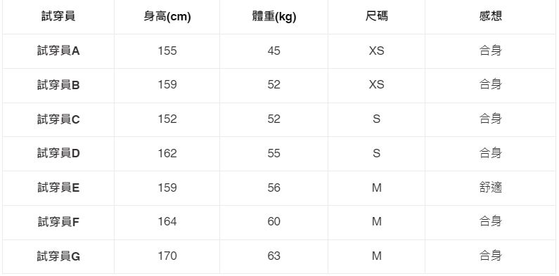※ 試穿員的身高體重與尺碼沒有絕對關係,尺碼會因個人身形而有所不同,試穿報告僅供參考喔。