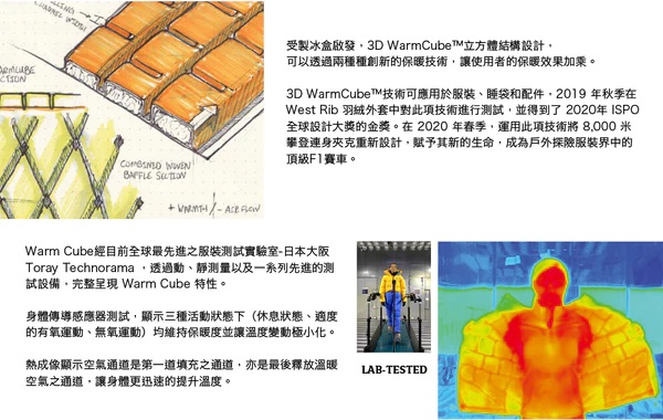 WarmCube ™技術可應用於服裝、睡袋和配件。2019 年秋季我們在 West Rib 羽絨外套中對此項技術進行了測試,並得到了 ISPO 歐洲戶外用品展的設計獎項。在 2020 年春季,我們運用此項技術將 8,000 米攀登連身夾克重新設計賦予其新的生命,讓它成為探險服裝界中的頂級 F1 賽車。