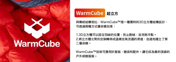 • 3D WarmCube ™結構可防止絨位移,加速熱量集中,提供極佳的熱調節效果。