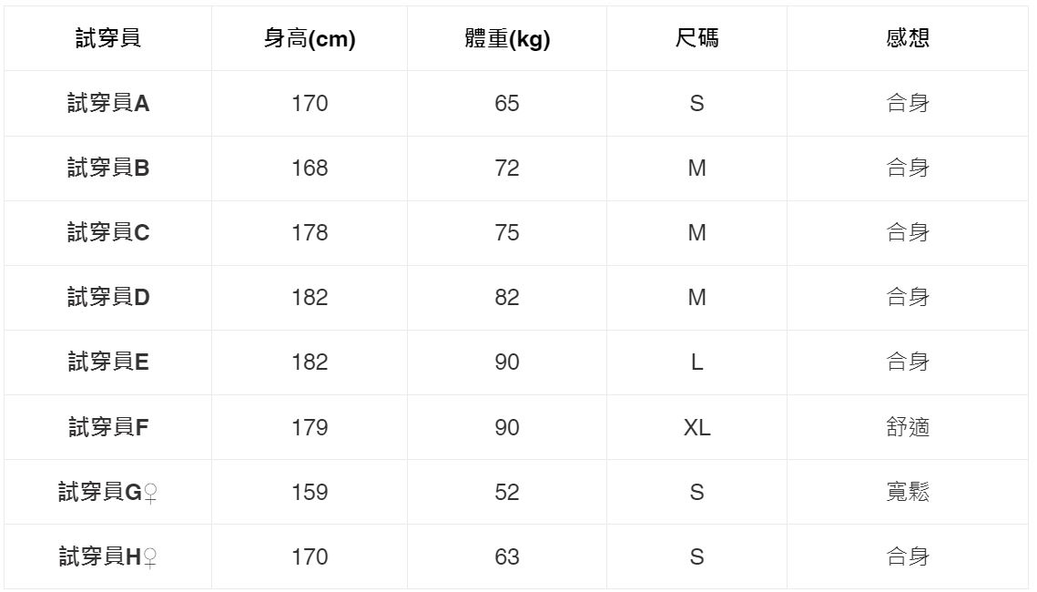 ※ 試穿感想依程度分為:貼身 / 合身 / 舒適 / 寬鬆。