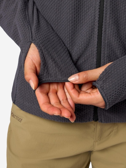 100% 再生聚酯刷毛:兼具輕量保暖與高透氣快乾特性,提供可壓縮收納的動態中層表現。