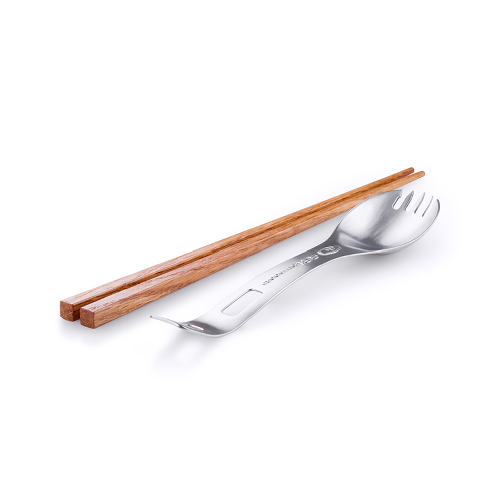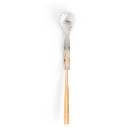 筷子可以穿入湯叉的尾端,變成長柄的餐具,適合在長形的鍋具中使用。