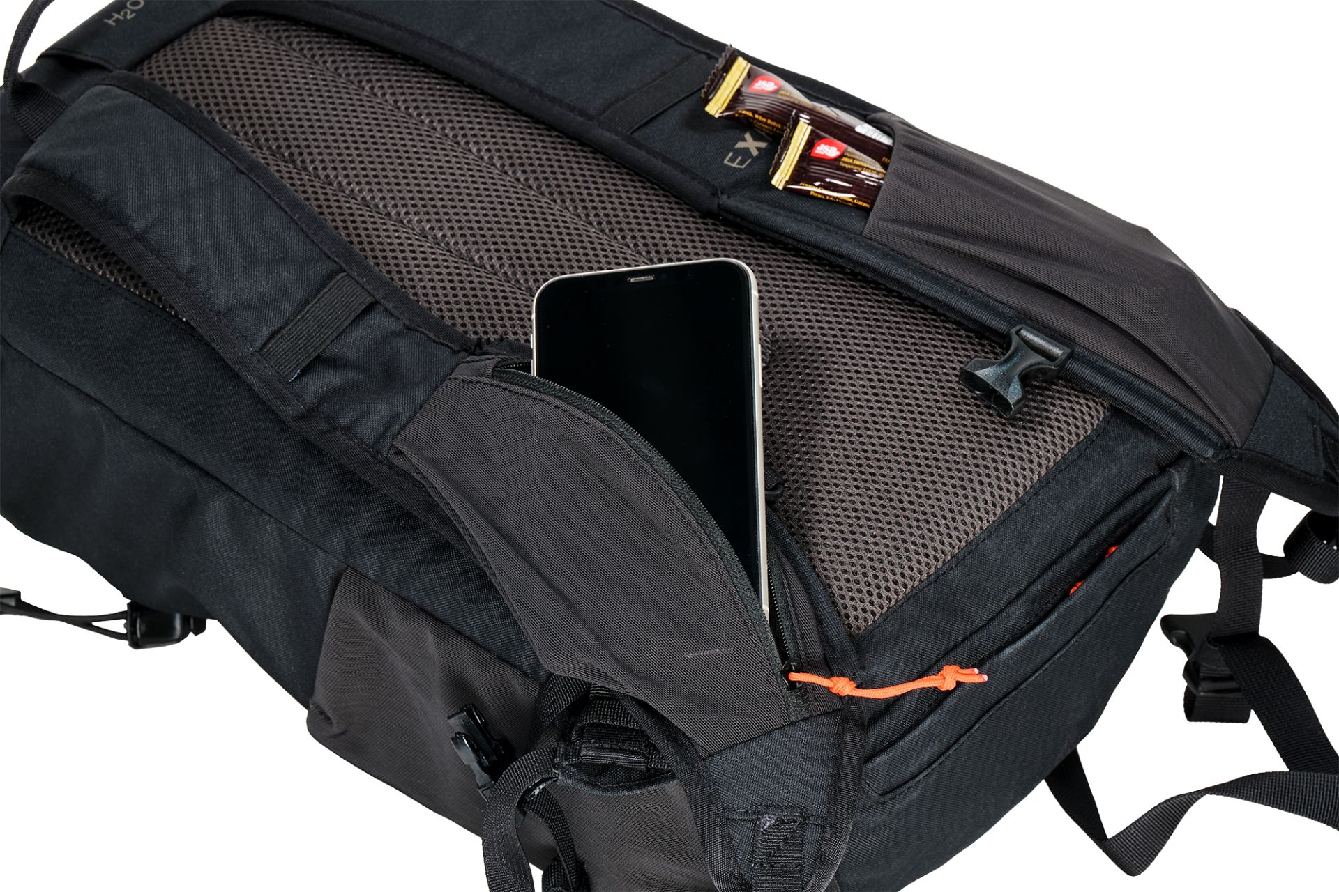 配置水袋出口背包主艙內另外設計水袋夾層,可搭配水袋掛勾,將吸管沿著水袋孔穿出至包外