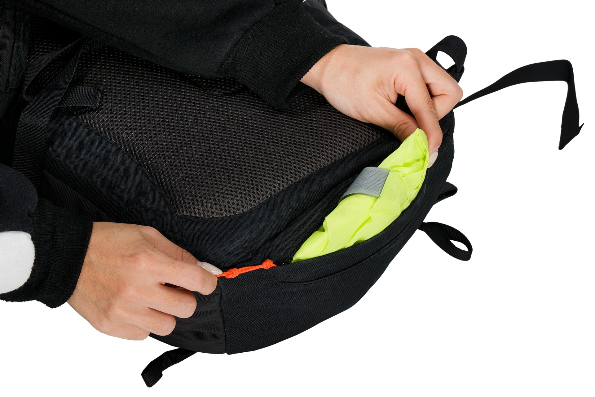 配置水袋出口背包主艙內另外設計水袋夾層,可搭配水袋掛勾,將吸管沿著水袋孔穿出至包外