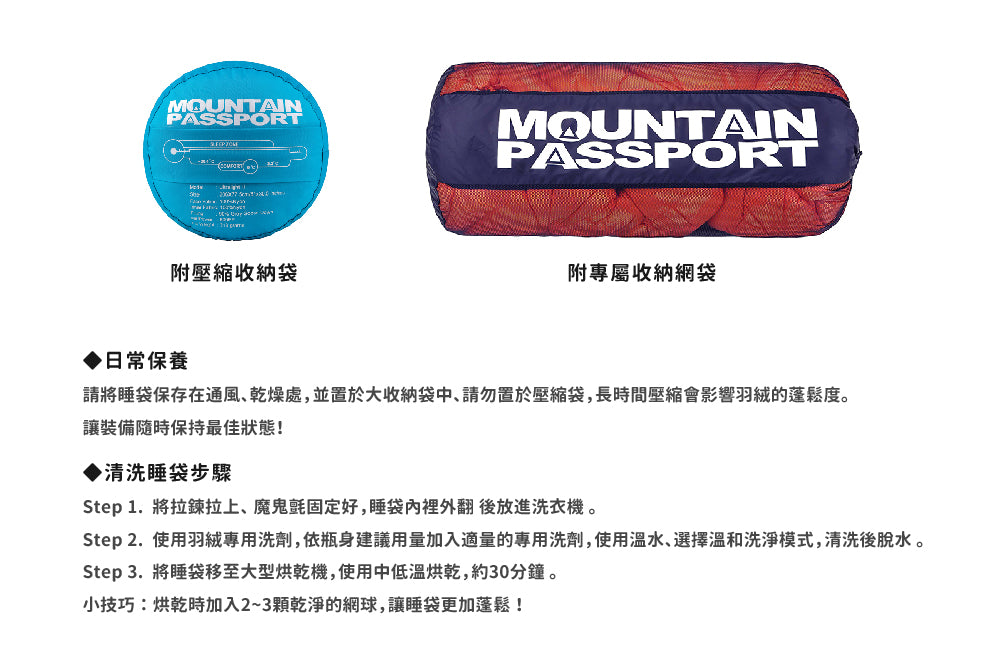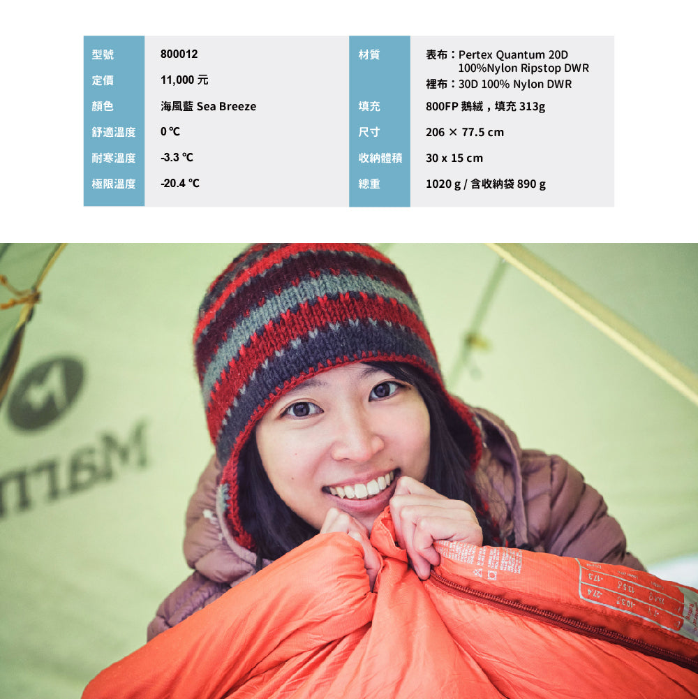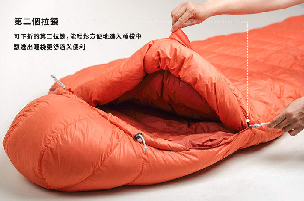 Mountain Passport結合國際級的設計標準、並加入貼近使用者經驗的功能、以及符合人體需求的睡袋結構,在原料上,不僅嚴選經認證的800+FP頂級優質鵝絨,更採用輕量、透氣、抗撕裂的Pertex Quantum表布,將這些元素融合並突破傳統概念,打造頂級的戶外鵝絨睡袋。