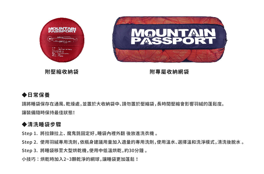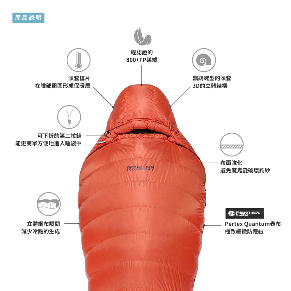 Mountain Passport結合國際級的設計標準、並加入貼近使用者經驗的功能、以及符合人體需求的睡袋結構,在原料上,不僅嚴選經認證的800+FP頂級優質鵝絨,更採用輕量、透氣、抗撕裂的Pertex Quantum表布,將這些元素融合並突破傳統概念,打造頂級的戶外鵝絨睡袋。