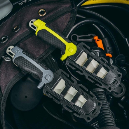 耐腐蝕、帶鋸齒狀的鈍頭刀片、線切割器及橡膠手柄。一款多功能且耐用之可快速取用之隨身刀。適合潛水探險、釣魚、划船,甚至救援使用