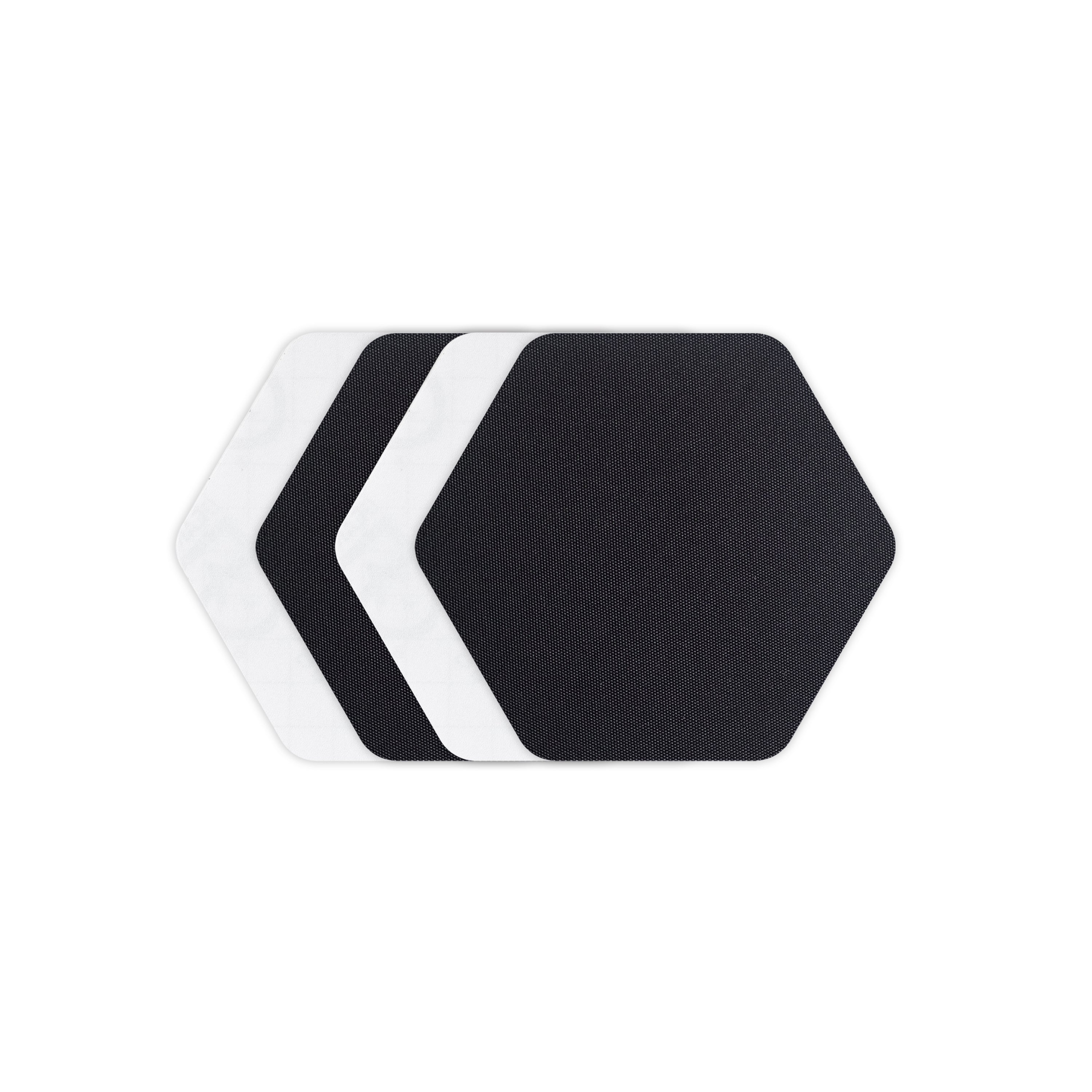 小六角非常適合羽絨外套、睡袋和背包板,而大六角則可以修復帳篷、睡墊等較大修復。 中性色融入傳統戶外和狩獵面料、純黑色非常適合深色面料、透明則適用於對任何顏色織物進行近乎透明的修復。