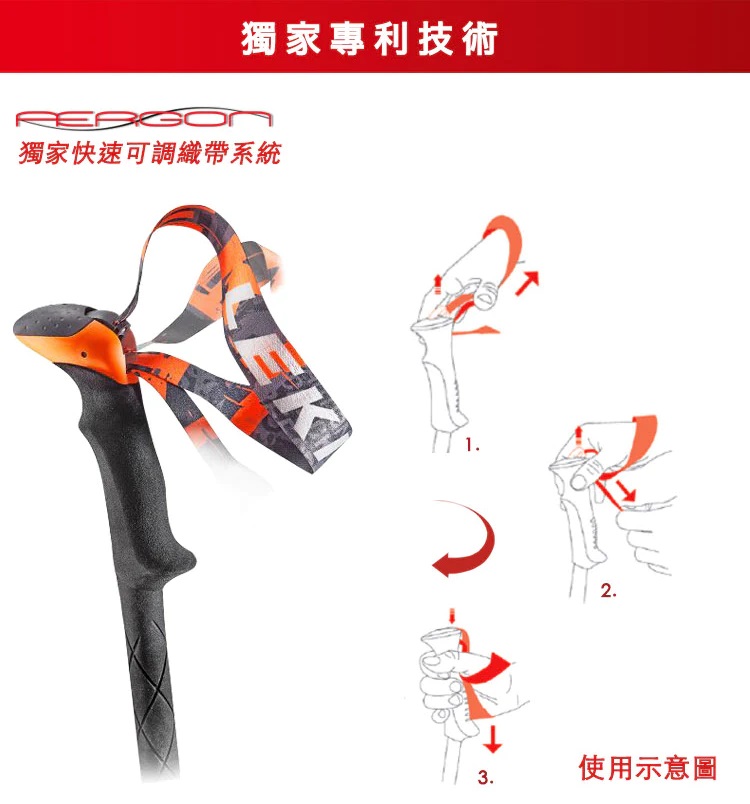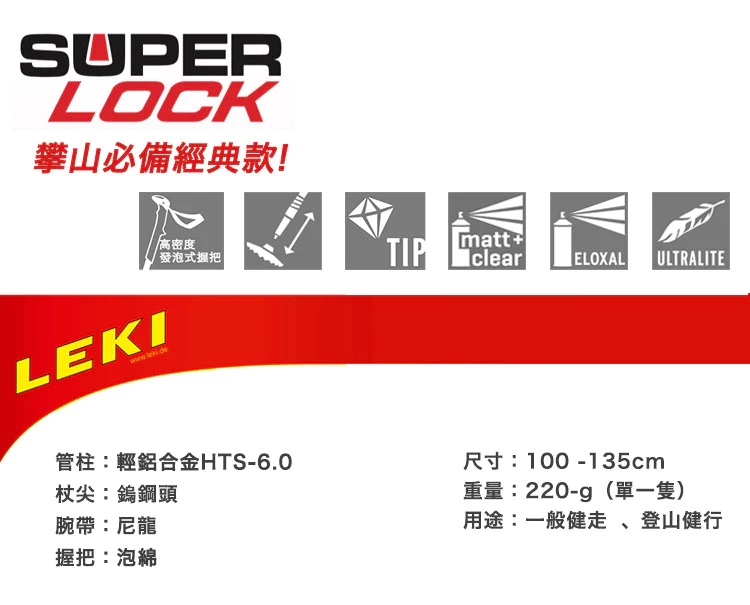 重量: 220g 單支管柱材質: 航太級鋁合金 管徑 Ø 16 14 12 mm握把材質: 泡綿握把避震系統: 無收納尺寸: 61cm使用長度: 100-135cm