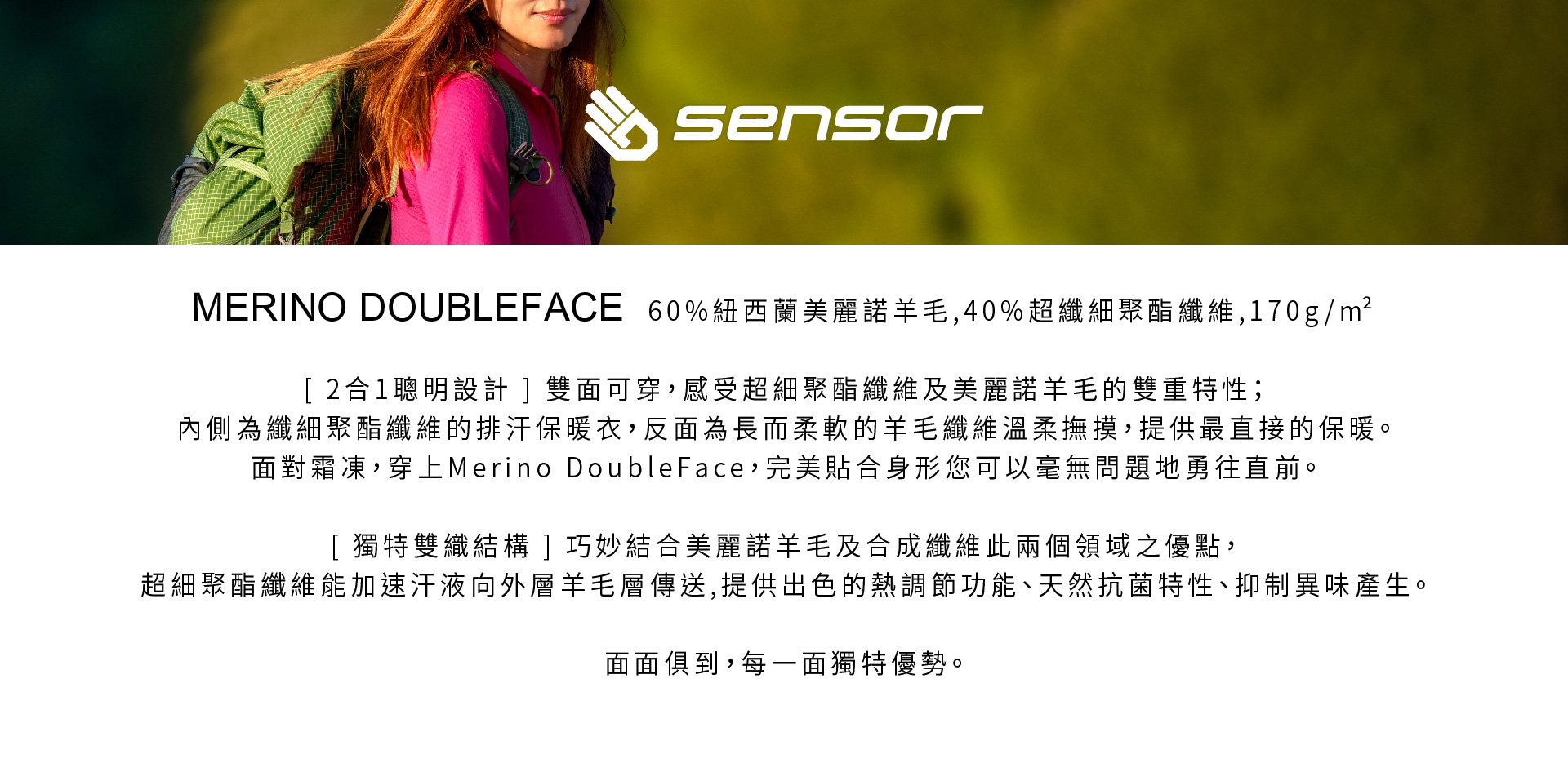 Merino Double Face 雙層機能布料:外層採用高品質美麗諾羊毛,內層結合聚酯纖維,兼具排汗速乾與恆溫保暖特性。