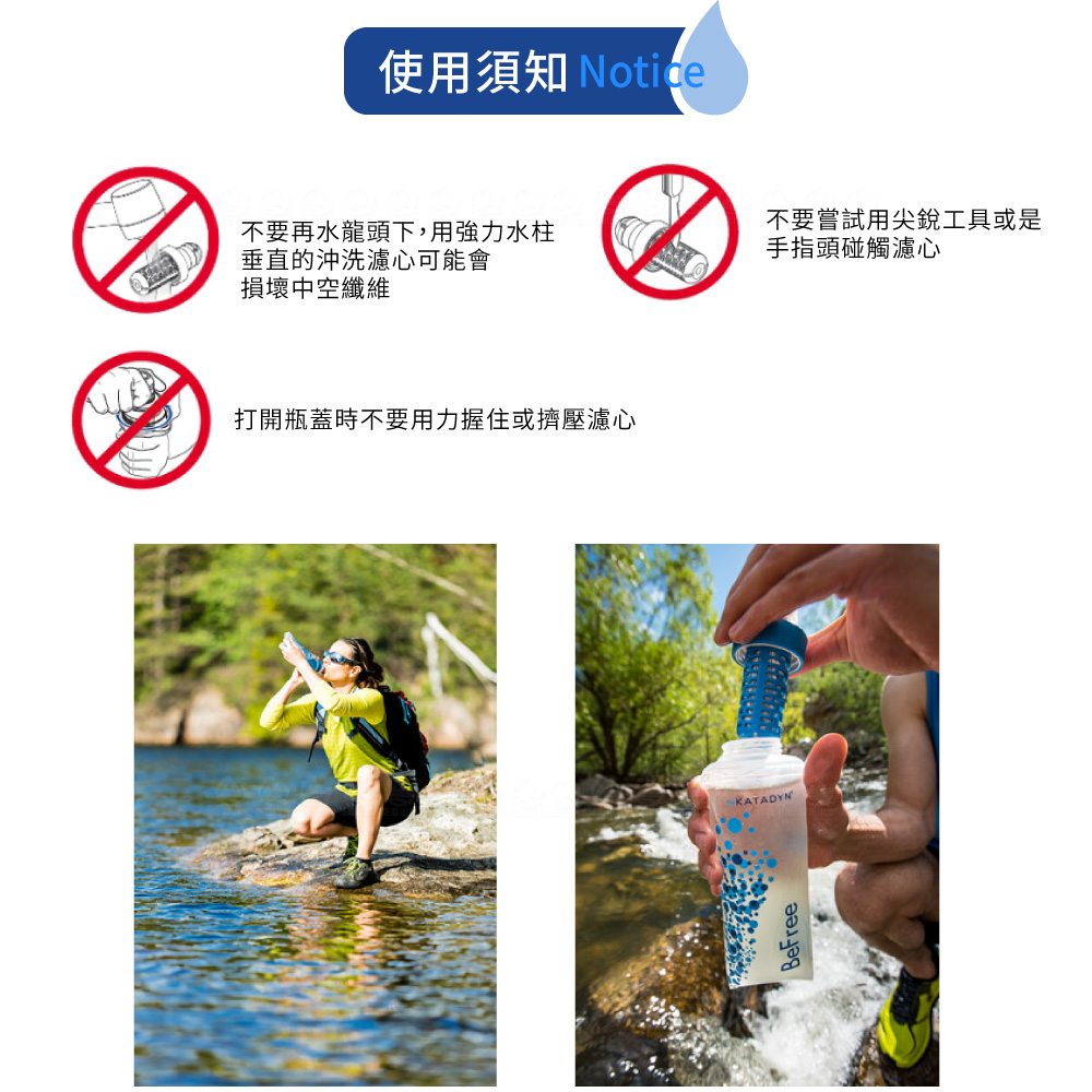 - 材質 : EZ-Clean Membrane™ with Hollow Fibers 中空纖維濾心 / Hydrapak® SoftFlaskTM made of TPU (100% PVC and BPA free) TPU水袋