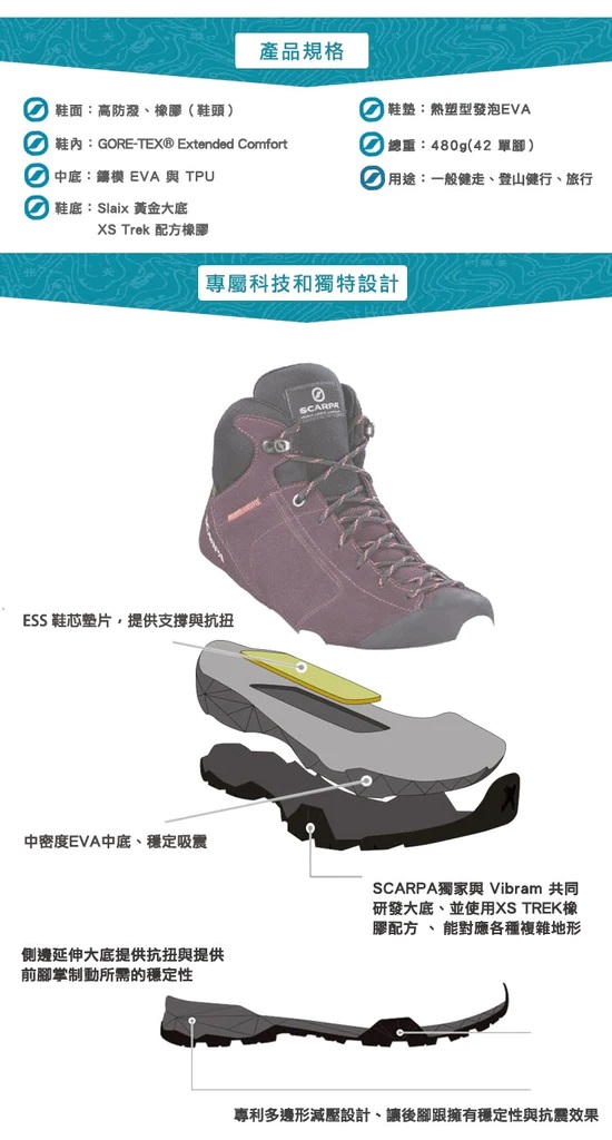 商品規格鞋面:麂皮裡層:GORETEX SURROUND® 全包膜防水中底:EVA鞋底:Vibram® XS Trek 材質