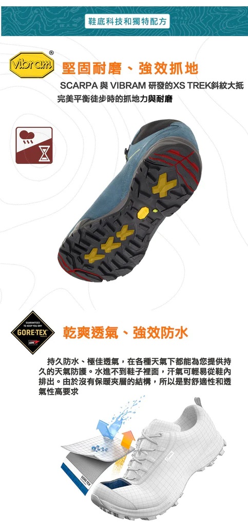商品規格鞋面:麂皮裡層:GORETEX SURROUND® 全包膜防水中底:EVA鞋底:Vibram® XS Trek 材質