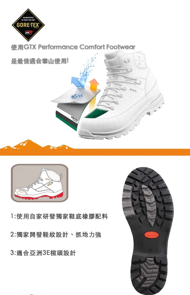 商品規格型號:10106 / C1_02S鞋面:合成皮革裡層:GORETEX® Performance Comfort鞋墊:EVA中底:EVA鞋底:獨家塑料大底重量:約1180g楦頭:3E
