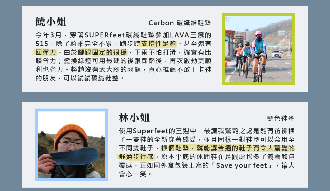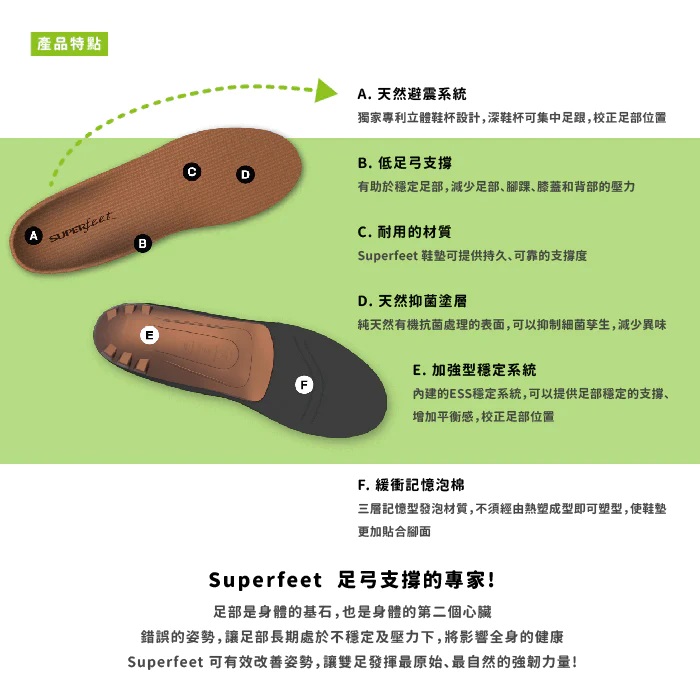 自 1977 年以來,Superfeet 藉由改變人們穿鞋的方式,完成了許多驚人的成就與目標。由於有著百年足部研究室的深厚基礎,Superfeet 以足部醫學的原理設計了優異而實惠的鞋墊,一雙輕薄多功能的鞋墊,改變的不僅是足部的不適,更能藉此調整身體的習慣與姿勢,讓雙足發揮最原始而自然的力量。