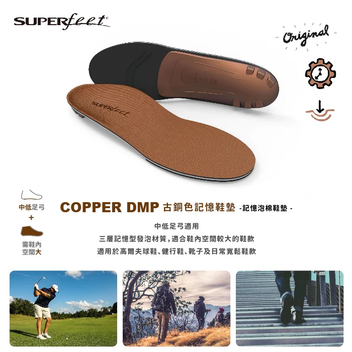 Superfeet COPPER DMP 使用 Dynamic Molding Process 動態成型三層發泡材,不須經由熱塑成型,長時間穿著,可隨時間符合足部形狀。
