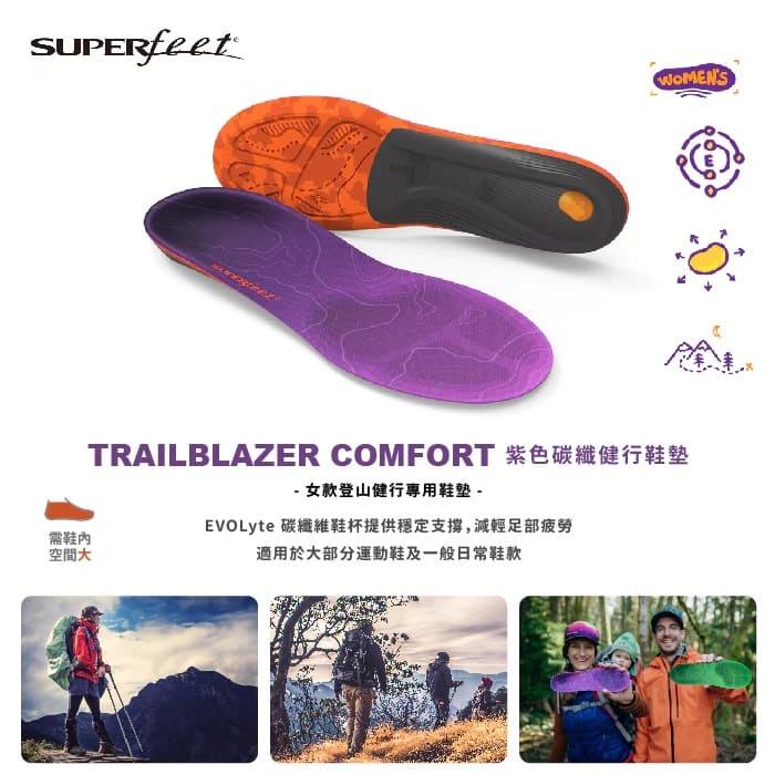 Women's TrailBlazer 是專門為女性設計的登山健行鞋墊,行進在不平整的地面時可以提高足部的穩定性。Superfeet 的鞋墊可以提供完美的支撐性,減少疲勞與摩擦,避免熱點與水泡生成。吸震效果絕佳的 AeroSpring 雙層舒適發泡材質讓你即使在崎嶇的地形上行進,也能增加舒適度。