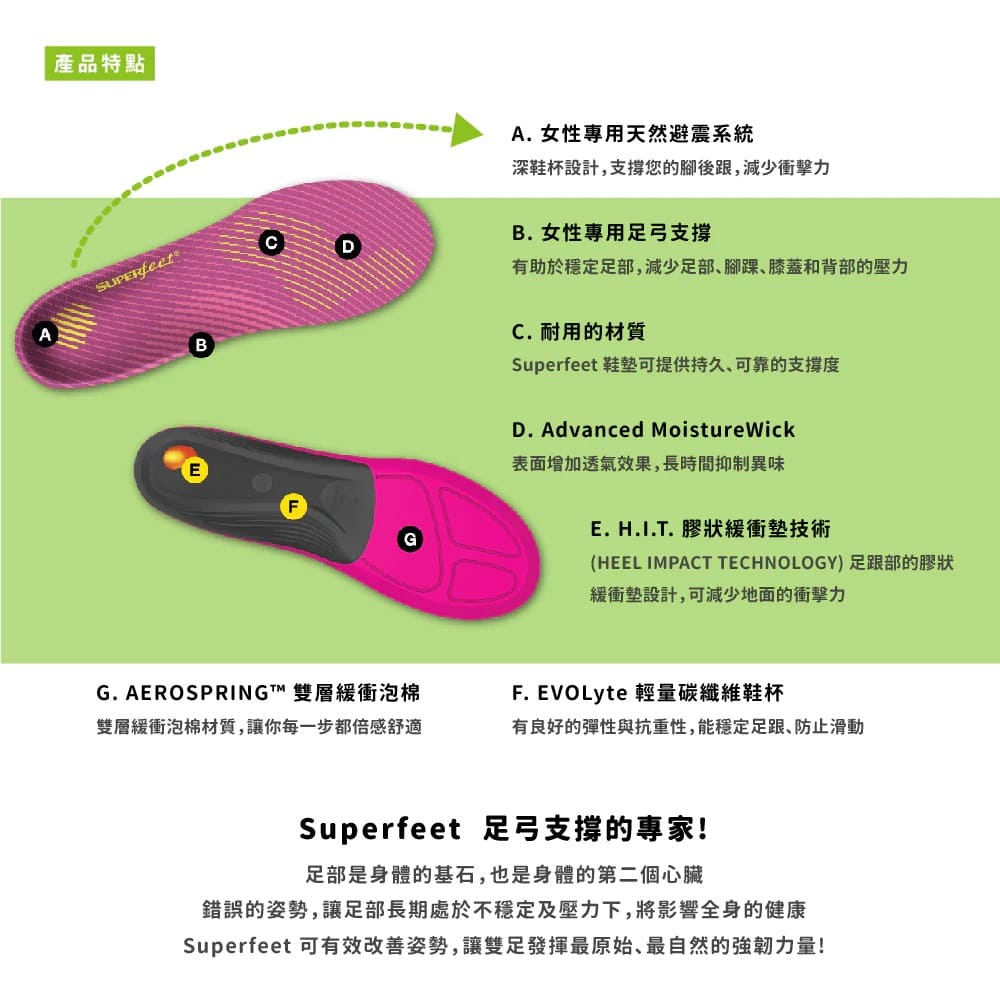 Women's RUN Insoles 是專門為了女性來設計的跑步鞋墊,可以幫助跑者提高效率時減少足部疲勞。Superfeet的鞋墊可以讓你的鞋子更加個人化,更適合你的足型。EVOLyte 碳纖維鞋杯與 AeroSpring 雙層舒適發泡材質不僅提升了舒適性與順暢度,更可以提高足部的能量傳遞效率。