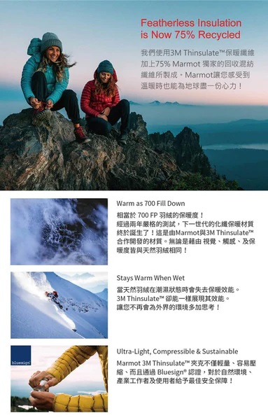 秉持著對專業的理想與堅持,Marmot 土撥鼠 自1973年創立至今,深受歐美各界專業人士的熱愛與肯定。為了不斷突破與創新,Marmot 除了具備龐大的專業設計團隊,更分別法國、蘇格蘭及美國成立了四大檢測中心,以確保產品的功能性、耐用性、舒適度及美觀上能達到最完美的平衡,近年又持續改良、突破,剪裁設計更加修飾身材。最新與3M聯合開發的Featherless化纖保暖材質更擁有優秀的表現,能對抗嚴苛的天候,在潮濕環境下比羽絨表現更好。