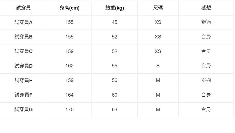 ※ 試穿員的身高體重與尺碼沒有絕對關係,尺碼會因個人身形而有所不同,試穿報告僅供參考。