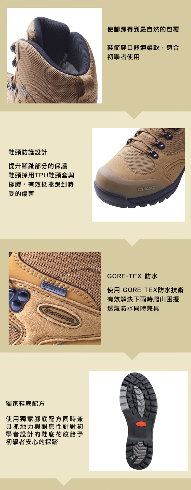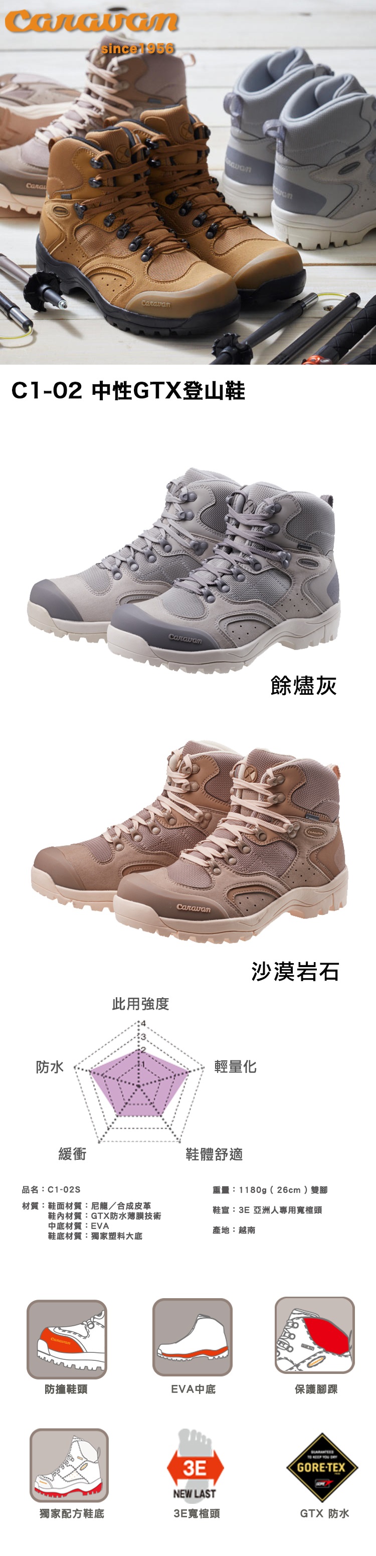 商品規格型號:10106 / C1_02S鞋面:合成皮革裡層:GORETEX® Performance Comfort鞋墊:EVA中底:EVA鞋底:獨家塑料大底重量:約1180g(26cm,雙腳)楦頭:3E