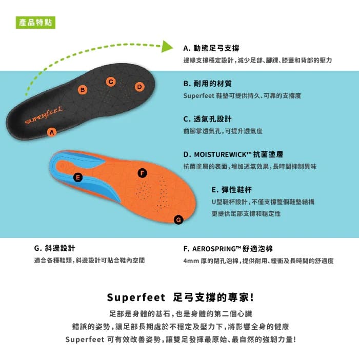 自 1977 年以來,Superfeet 藉由改變人們穿鞋的方式,完成了許多驚人的成就與目標。由於有著百年足部研究室的深厚基礎,Superfeet 以足部醫學的原理設計了優異而實惠的鞋墊,一雙輕薄多功能的鞋墊,改變的不僅是足部的不適,更能藉此調整身體的習慣與姿勢,讓雙足發揮最原始而自然的力量。