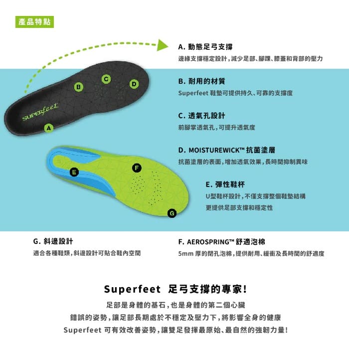 自 1977 年以來,Superfeet 藉由改變人們穿鞋的方式,完成了許多驚人的成就與目標。由於有著百年足部研究室的深厚基礎,Superfeet 以足部醫學的原理設計了優異而實惠的鞋墊,一雙輕薄多功能的鞋墊,改變的不僅是足部的不適,更能藉此調整身體的習慣與姿勢,讓雙足發揮最原始而自然的力量。