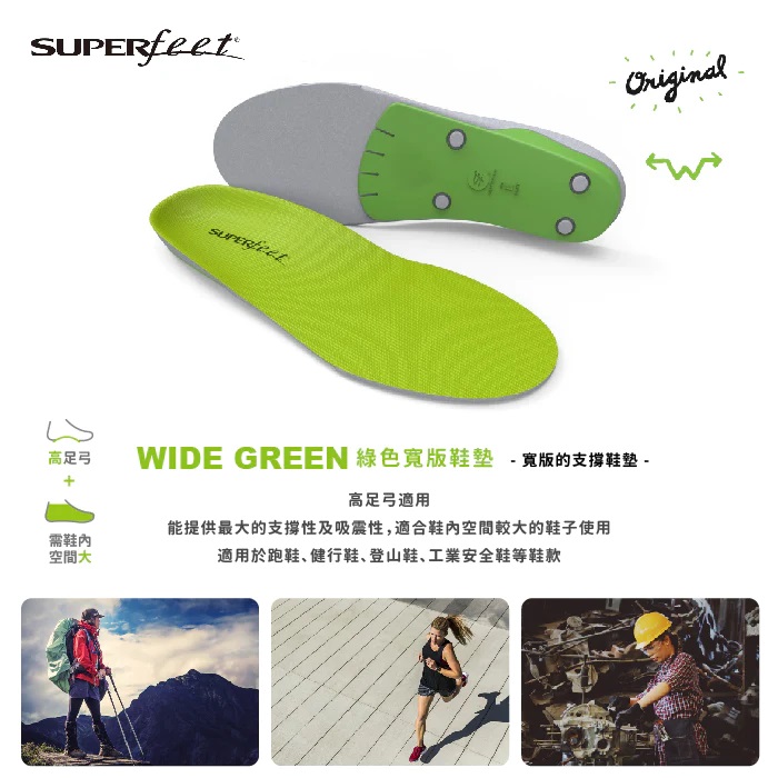 Superfeet GREEN 能提供最大的支撐性及吸震性,專為鞋內空間較大、可以移除鞋墊的鞋型所設計。