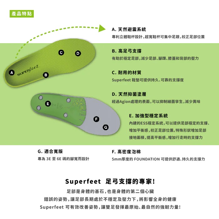 自 1977 年以來,Superfeet 藉由改變人們穿鞋的方式,完成了許多驚人的成就與目標。由於有著百年足部研究室的深厚基礎,Superfeet 以足部醫學的原理設計了優異而實惠的鞋墊,一雙輕薄多功能的鞋墊,改變的不僅是足部的不適,更能藉此調整身體的習慣與姿勢,讓雙足發揮最原始而自然的力量。