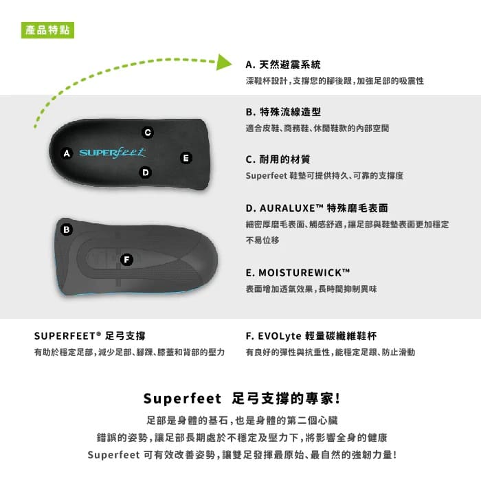 自 1977 年以來,Superfeet 藉由改變人們穿鞋的方式,完成了許多驚人的成就與目標。由於有著百年足部研究室的深厚基礎,Superfeet 以足部醫學的原理設計了優異而實惠的鞋墊,一雙輕薄多功能的鞋墊,改變的不僅是足部的不適,更能藉此調整身體的習慣與姿勢,讓雙足發揮最原始而自然的力量。