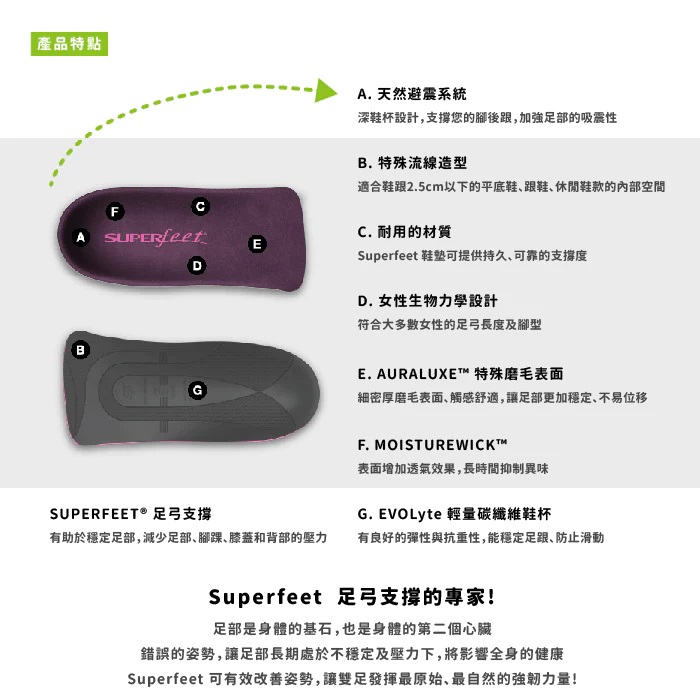 自 1977 年以來,Superfeet 藉由改變人們穿鞋的方式,完成了許多驚人的成就與目標。由於有著百年足部研究室的深厚基礎,Superfeet 以足部醫學的原理設計了優異而實惠的鞋墊,一雙輕薄多功能的鞋墊,改變的不僅是足部的不適,更能藉此調整身體的習慣與姿勢,讓雙足發揮最原始而自然的力量。