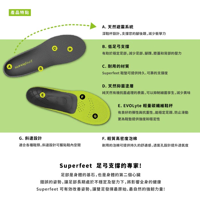 「Superfeet由兩個醫師發明,顛覆大部分鞋墊強調緩衝、避震的概念,從人體足部的構造去研發適合的鞋墊,已經是醫療等級的,價格遠低於矯正鞋墊。」