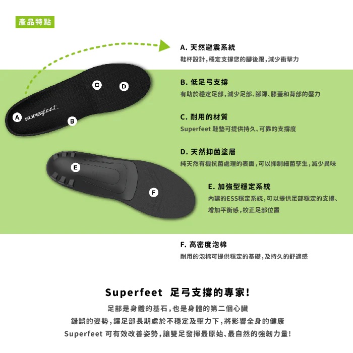 「Superfeet由兩個醫師發明,顛覆大部分鞋墊強調緩衝、避震的概念,從人體足部的構造去研發適合的鞋墊,已經是醫療等級的,價格遠低於矯正鞋墊。