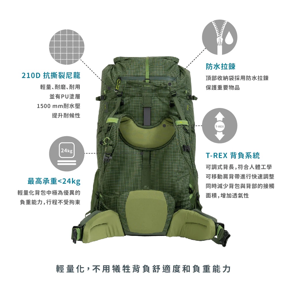 獨特的T-Rex背負系統,可移動肩背帶能快速調整,同時減少背包與背部的接觸增加透氣性