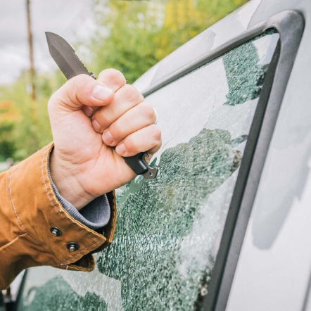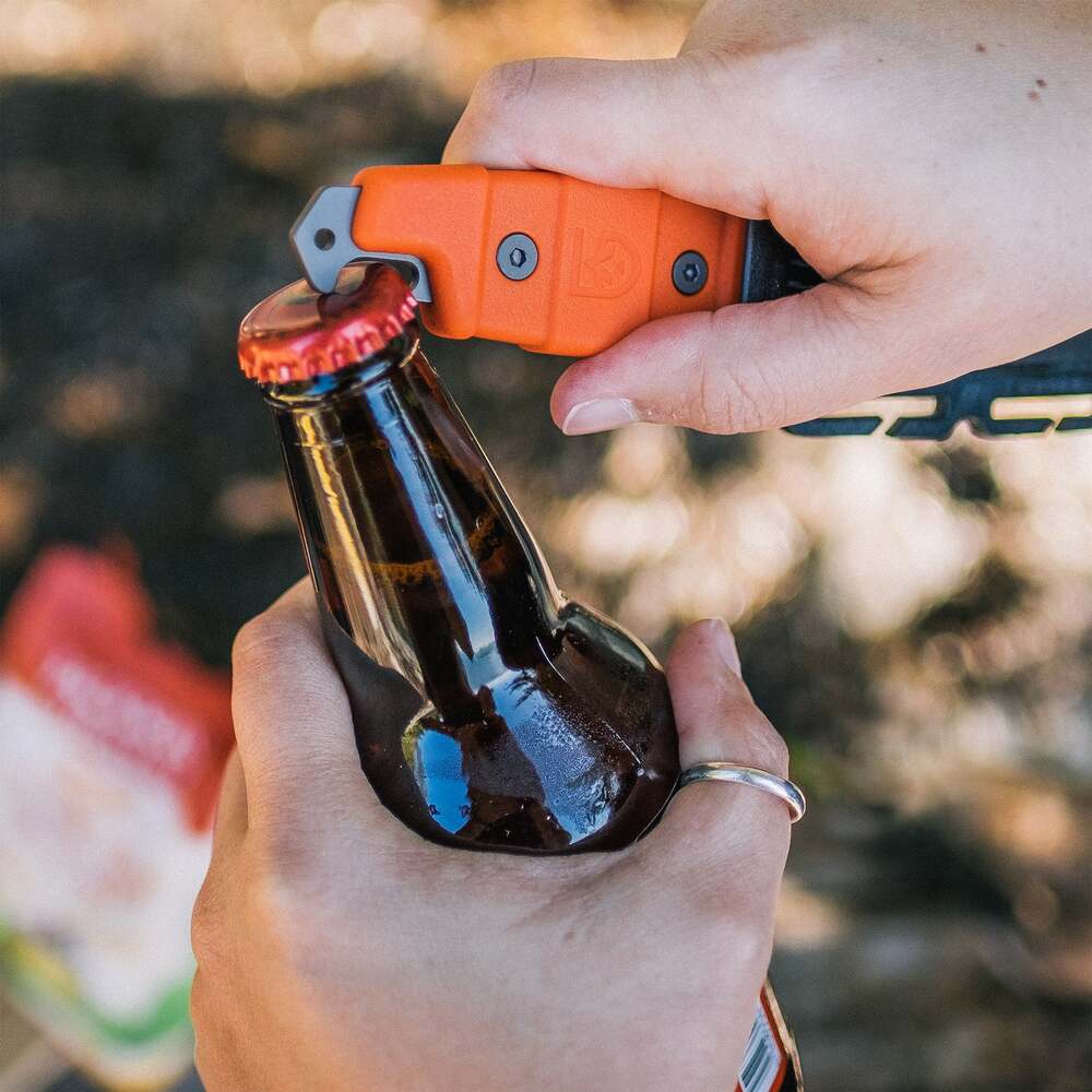 鋸齒面利於切營繩,柄底開瓶器及玻璃擊碎器功能。