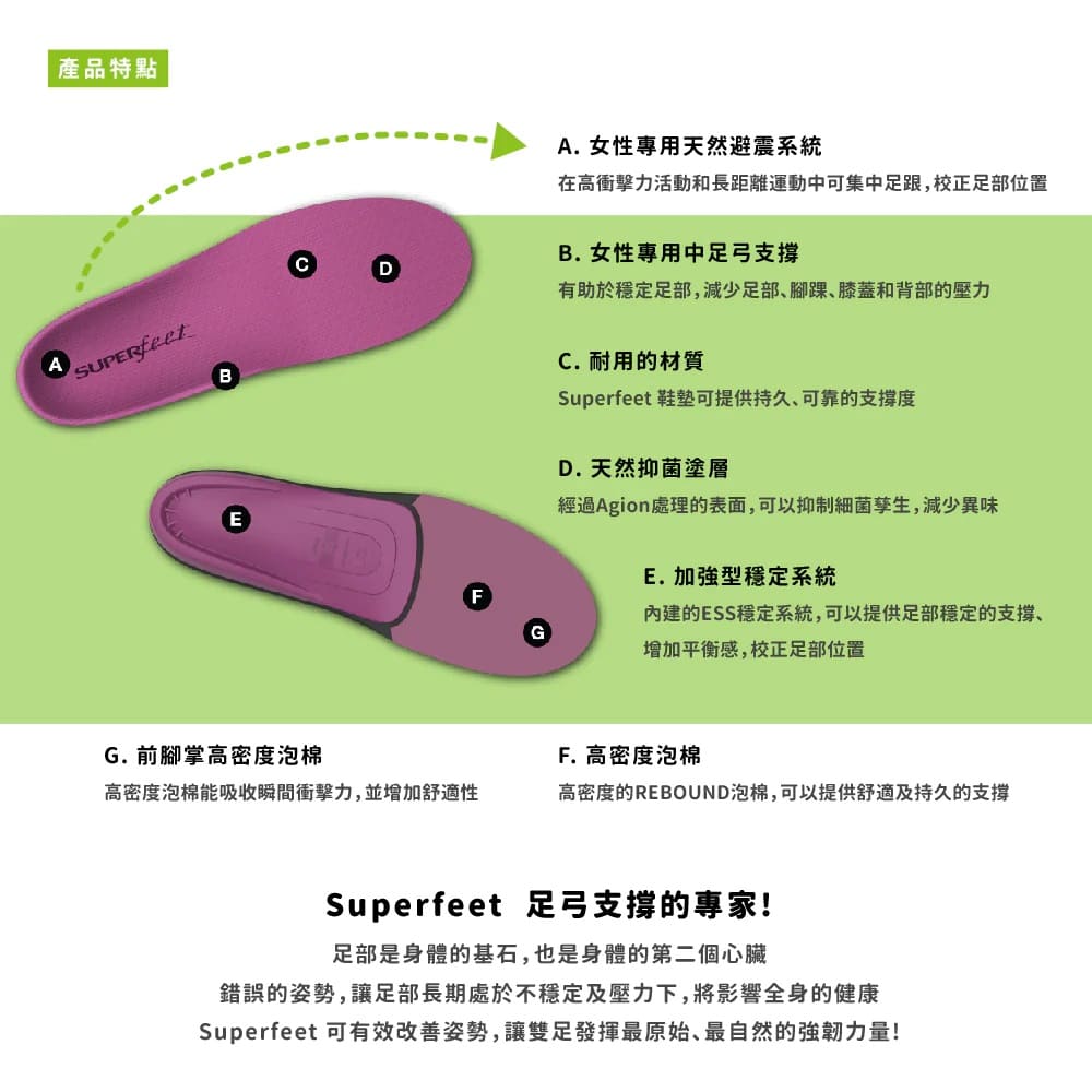除了具有和Superfeet ORANGE相同特性之外,還包括以下女性專用特點: