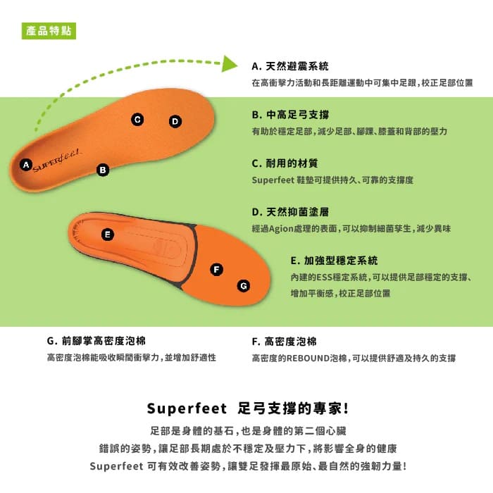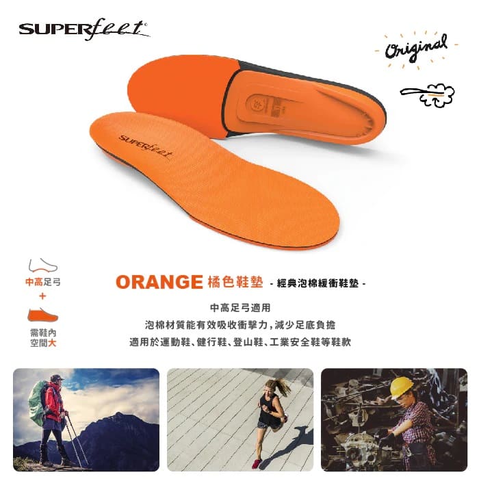 「離不開superfeet之後,除了登山之外,日常生活也需要它,用綠色放在路跑鞋內是種折磨,橘色前半部的Closed-cell foam 提供足夠的緩衝,後半部一樣是塑膠硬底的設計,只是足弓沒那麼高。」