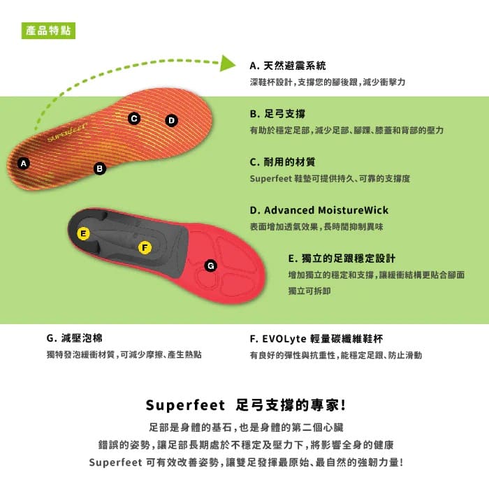 自 1977 年以來,Superfeet 藉由改變人們穿鞋的方式,完成了許多驚人的成就與目標。由於有著百年足部研究室的深厚基礎,Superfeet 以足部醫學的原理設計了優異而實惠的鞋墊,一雙輕薄多功能的鞋墊,改變的不僅是足部的不適,更能藉此調整身體的習慣與姿勢,讓雙足發揮最原始而自然的力量。