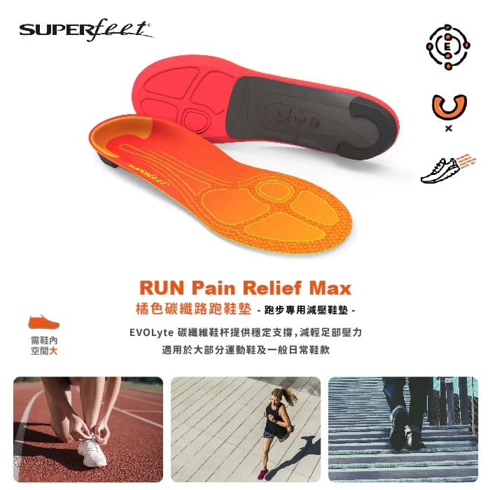 RUN Pain Relife Max Insoles是專門為跑步來設計的鞋墊,可以幫助跑者穩定足部結構,減少跑步產生的壓力。Superfeet 的鞋墊可以讓你的鞋子更加個人化,更適合你的足型。獨立的足弓穩定設計讓鞋墊更加貼合腳面。
