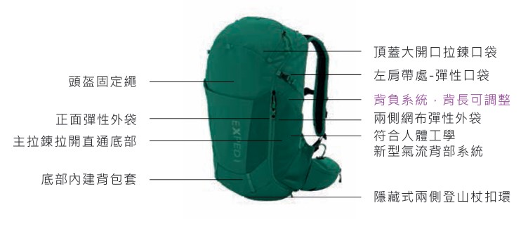 靈活的氣流系統,背負時亦可自然地向後移動。 30L 和 45L,透過輕質鋼框架,可調整背長。( 12L 及 20L 無法調整背長)